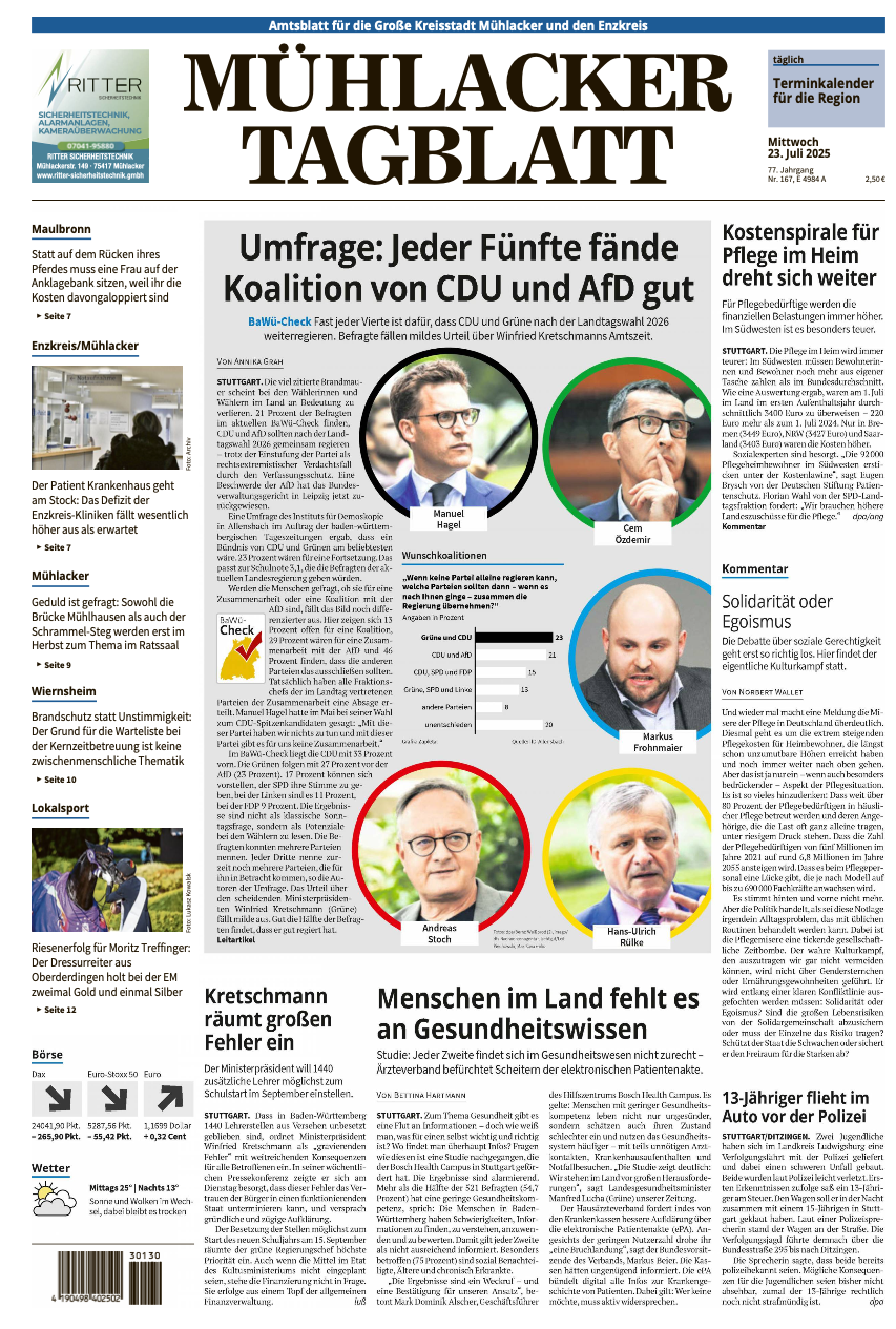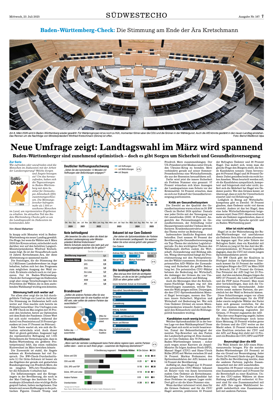 Im März 2026 wird in Baden-Württemberg gewählt, und wenn sich die meisten zurzeit auch noch nicht intensiv mit der Wahl auseinandersetzen, haben die Bürger doch klare Vorstellungen von den Themen, um die es bei der Wahl gehen muss. Als wichtigste Themen werden innere Sicherheit und die Gesundheitsversorgung benannt: 57 Prozent wünschen klare Aussagen der Parteien zur Verbesserung der inneren Sicherheit, 54 Prozent zur Zukunft der Gesundheitsversorgung. Beide Themen sind nicht nur in Baden-Württemberg, sondern bundesweit auf der Agenda der Bürger nach vorne gerückt. Das gilt insbesondere für die Gesundheitsversorgung; lange war die Bevölkerung mit dem Gesundheitssystem und der Qualität der Versorgung zufrieden. Seit zwei, drei Jahren wächst jedoch die Verunsicherung; vielen wird immer mehr bewusst, dass das Gesundheitswesen personell erodiert, Hausarztpraxen geschlossen werden, generell Ärzte und Pflegekräfte fehlen, Krankenhäuser und Praxen zusammengelegt werden müssen; insbesondere ländliche Regionen sind betroffen. Daher führt die Gesundheitsversorgung auch die Agenda der Bevölkerung in den ländlichen Regionen an: 60 Prozent der Bevölkerung auf dem Land zählen die Gesundheitsversorgung zu den wichtigsten Themen der nächsten Legislaturperiode, in den großen Städten dagegen nur knapp jeder Zweite. Die Bedeutung, die diesem Thema beigemessen wird, ist auch ausgeprägt altersgebunden: Unter 30-Jährige messen dem Thema Gesundheitsversorgung unterdurchschnittliche Bedeutung zu, die 60-Jährigen und Älteren überdurchschnittliche.