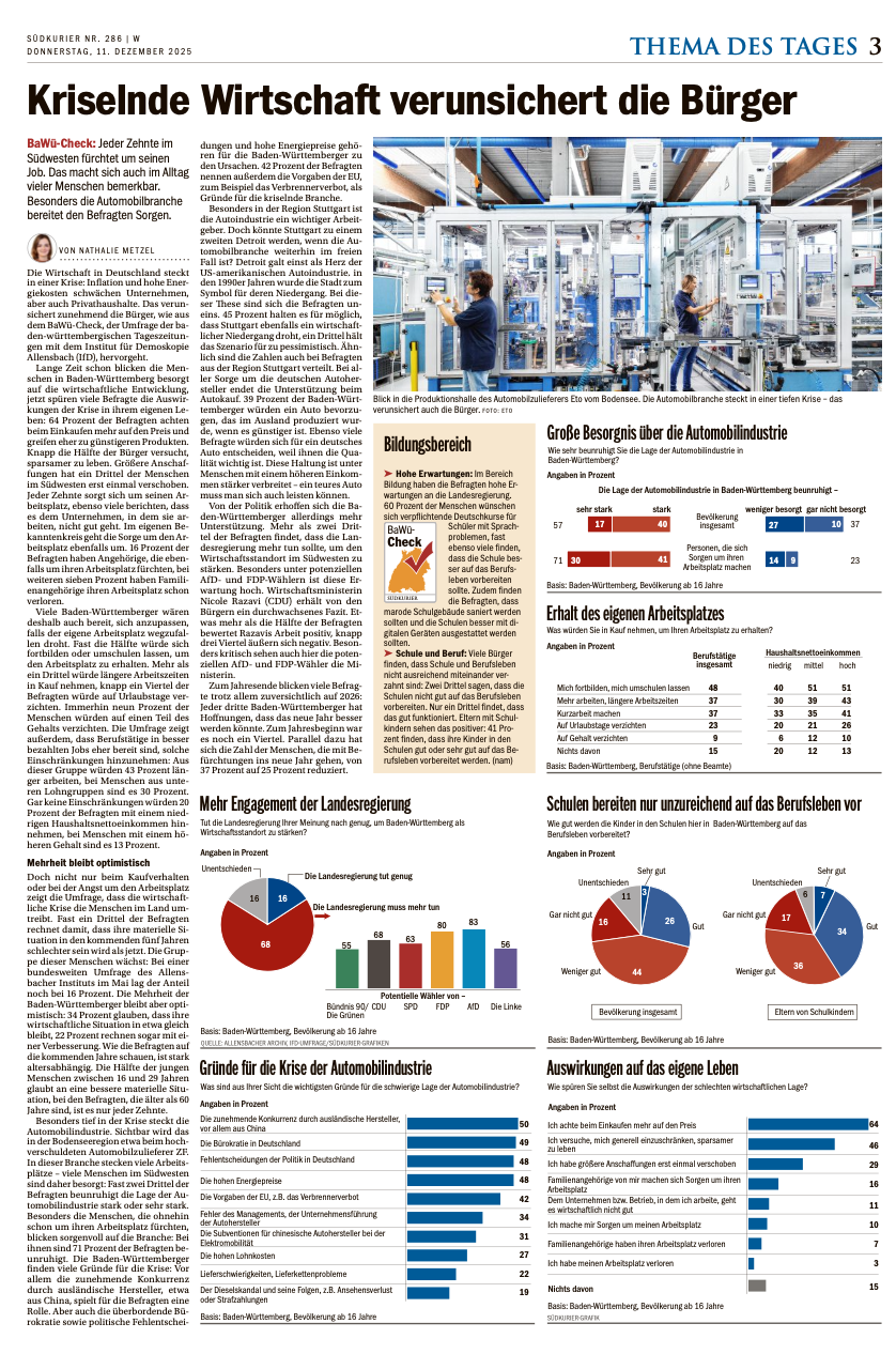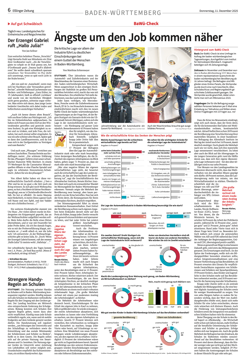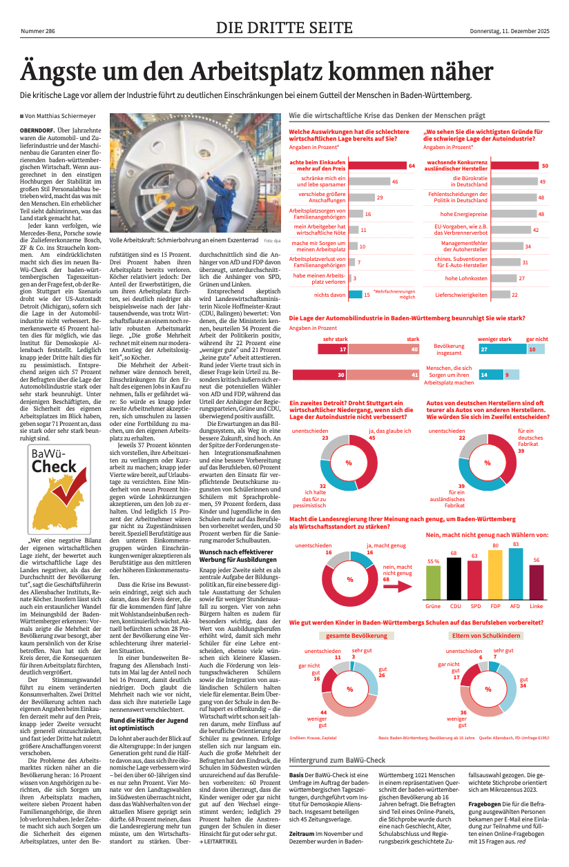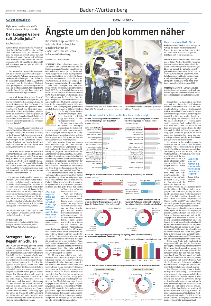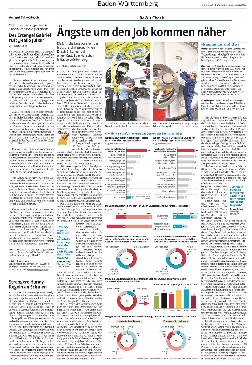 Besonders groß sind die Sorgen um den Automobilstandort Baden-Württemberg. Die Mehrheit der Bürger zeigt sich angesichts der Schwierigkeiten der Autoindustrie stark beunruhigt, unter Beschäftigten mit eigener Jobunsicherheit sogar über 70 Prozent.