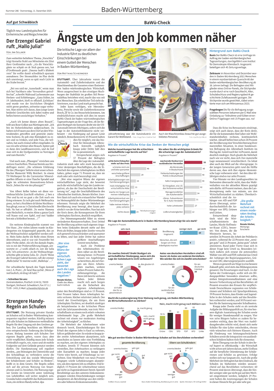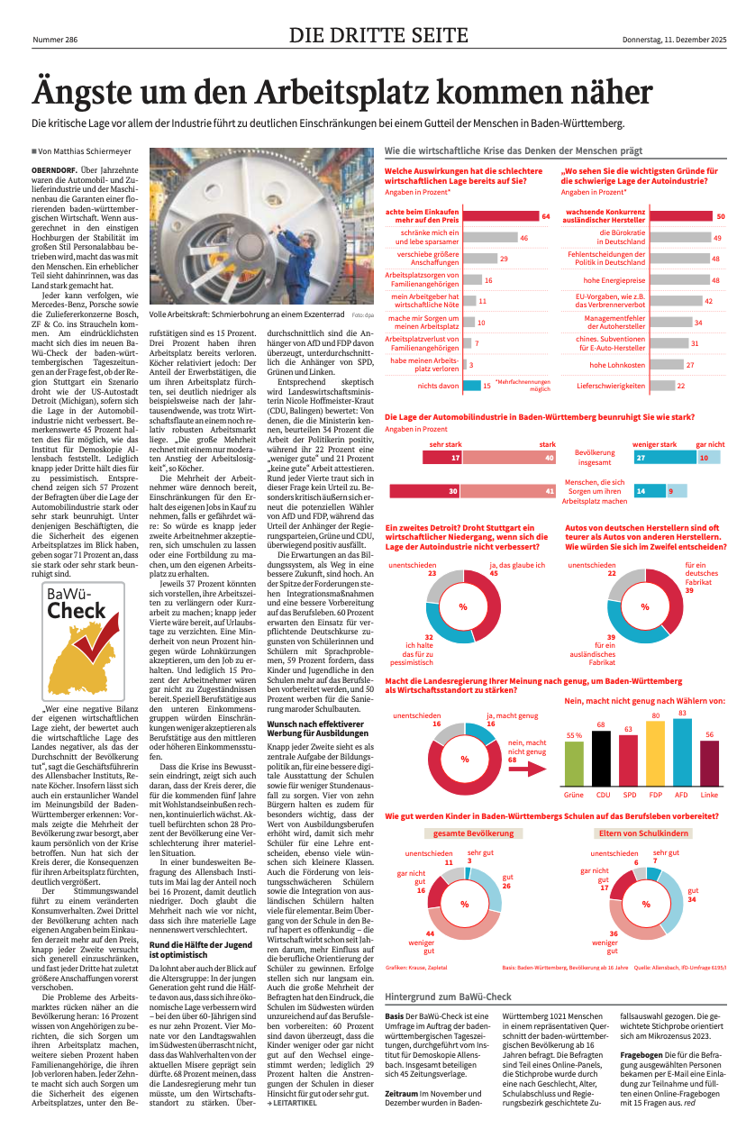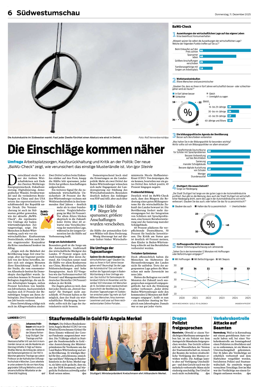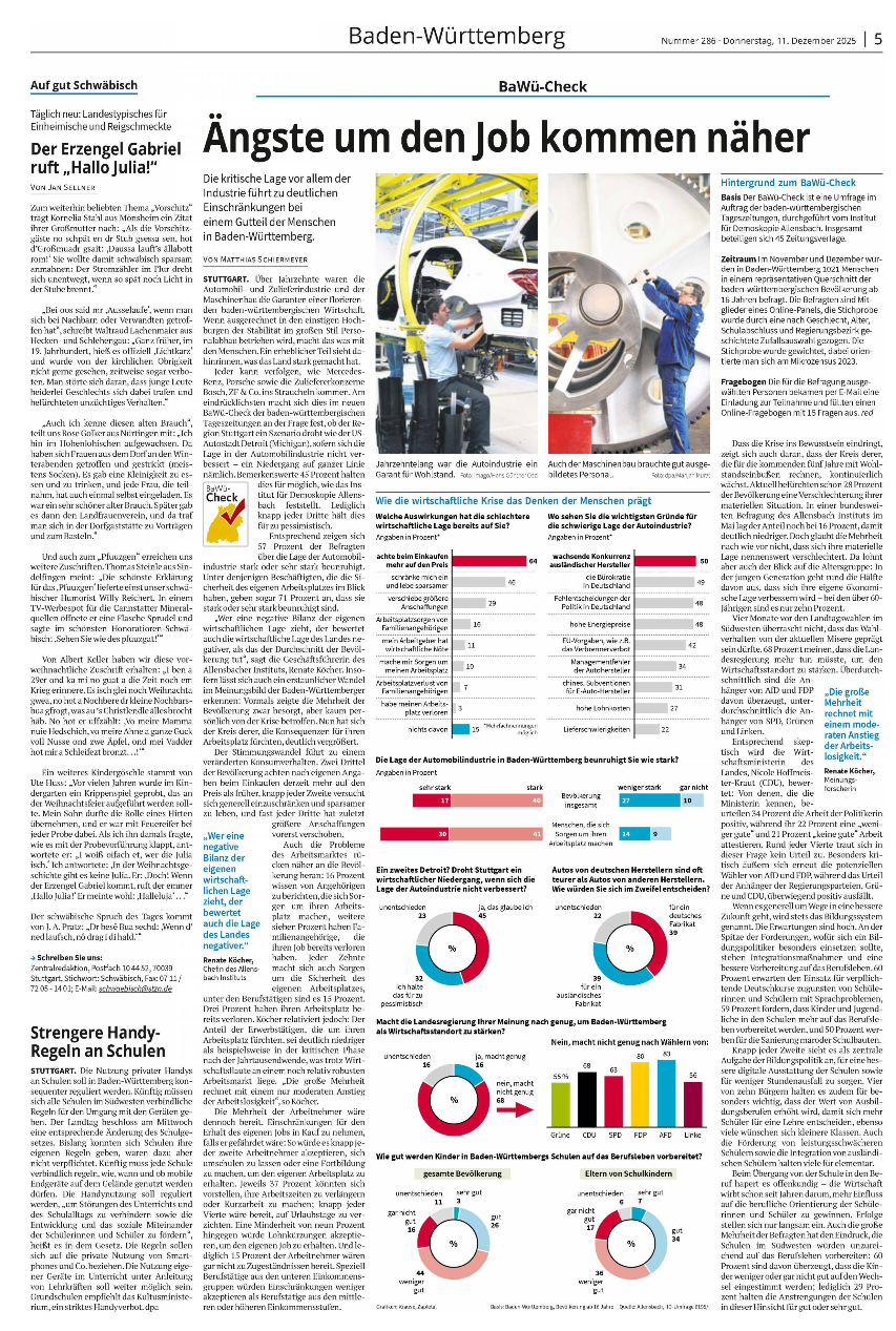 Besonders groß sind die Sorgen um den Automobilstandort Baden-Württemberg. Die Mehrheit der Bürger zeigt sich angesichts der Schwierigkeiten der Autoindustrie stark beunruhigt, unter Beschäftigten mit eigener Jobunsicherheit sogar über 70 Prozent.