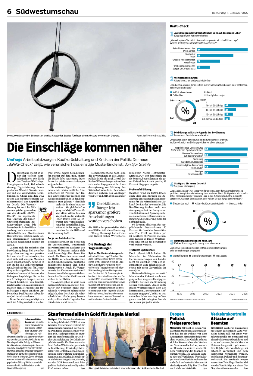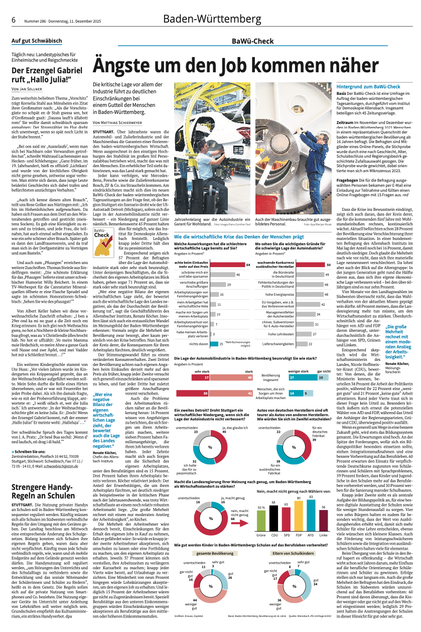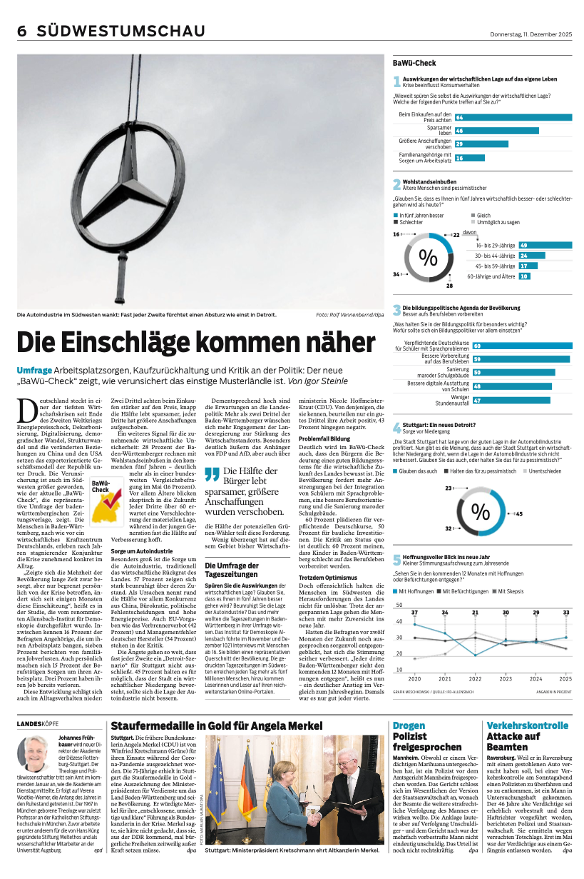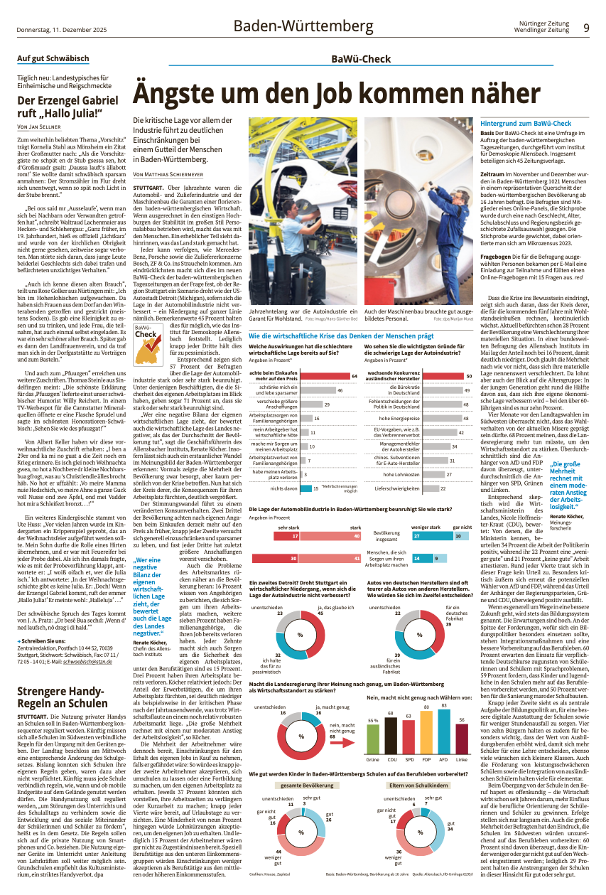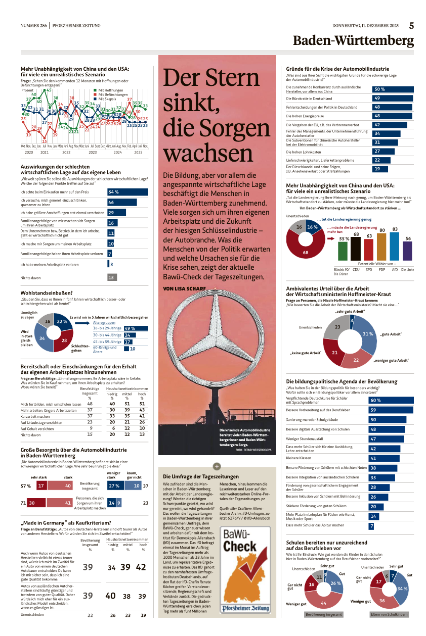 Besonders groß sind die Sorgen um den Automobilstandort Baden-Württemberg. Die Mehrheit der Bürger zeigt sich angesichts der Schwierigkeiten der Autoindustrie stark beunruhigt, unter Beschäftigten mit eigener Jobunsicherheit sogar über 70 Prozent.